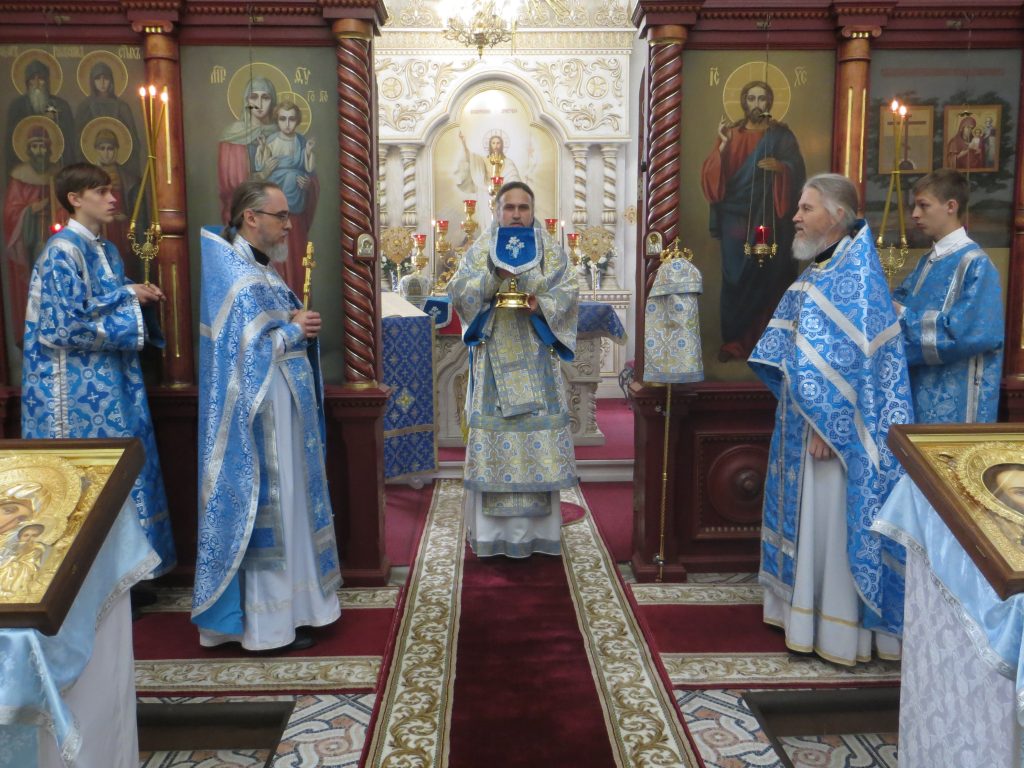 Его преосвященству сослужили настоятель собора иерей Сергий Макаров, иерей Владислав Феценко и диакон Дионисий Сударкин.